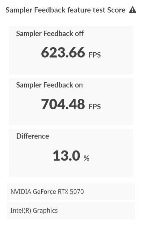 三項 feature test 的成績:DirectX Raytracing 獲得平均 57.64 FPS、Mesh Shader 在開啟後提升 110.2% 達到 689.76 FPS、Sampler Feedback 則是在開啟後有 13% 的小幅提升。