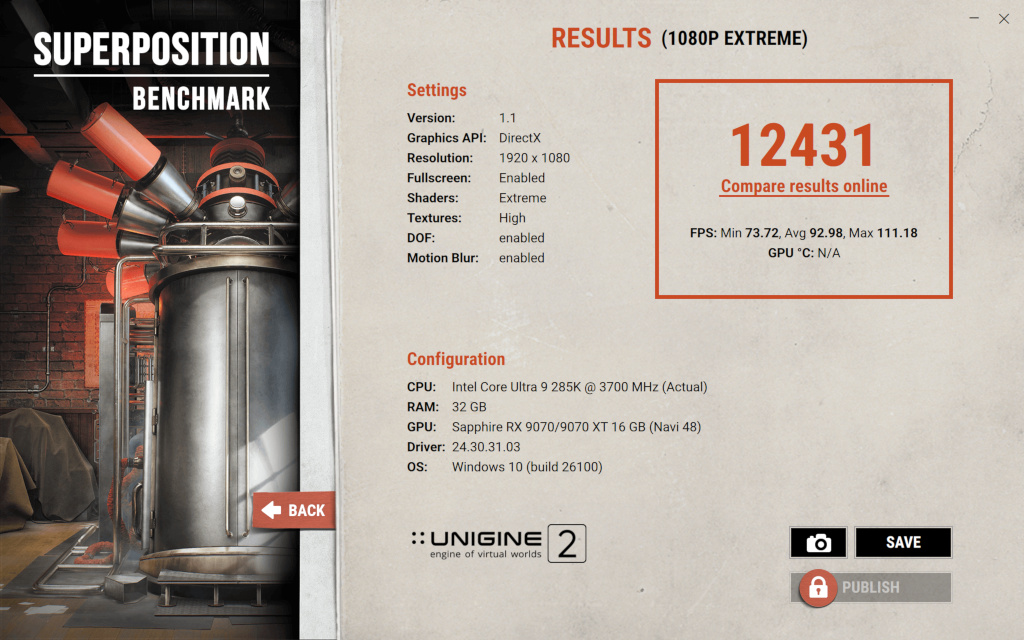 遊戲部分來看一下簡單的 Superposition Benchmark 的 4 項解析度設定成績,1080p Medium 獲得 36141分、平均 270.32 FPS,1080p High 得分 27799、平均 207.92 FPS,1080p Extreme 獲得 12431 分、平均 92.98 FPS,4K Optimized 則是獲得 17168 分、平均 128.41 FPS,基本上這部分與 RTX 5070 算是伯仲之間。