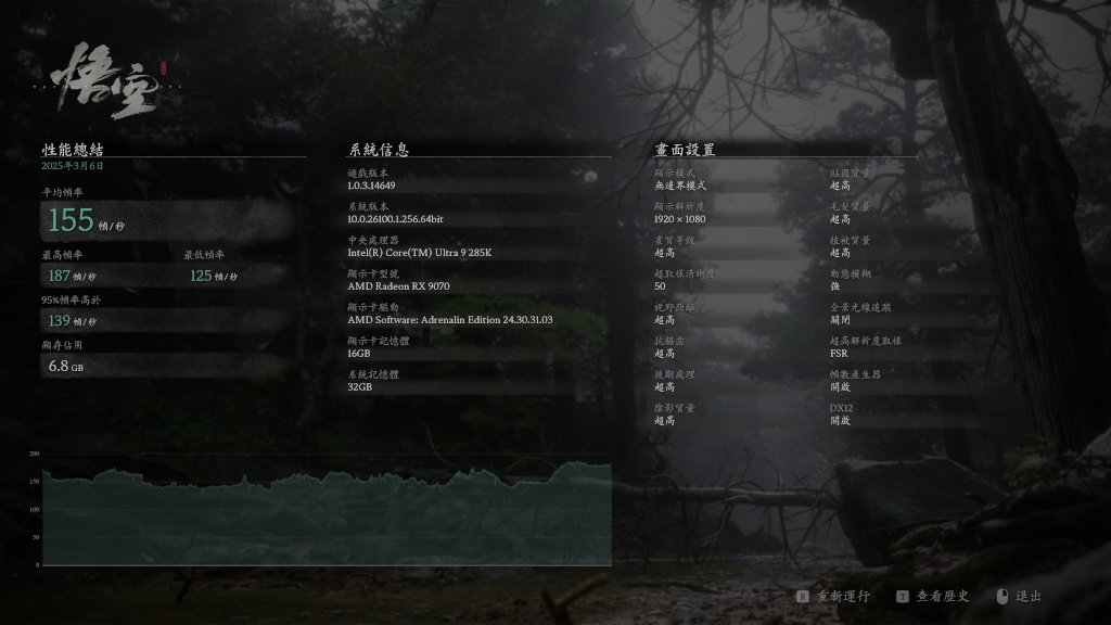 在《黑神話:悟空》的部分,同樣都是採用超高畫質設定、關閉全景光追下的幀數表現,PULSE RX 9070 能夠獲得 4K 解析度下達到 106 張的數據,比起 RTX 5070 的 87 FPS 提升可說不少;如果採用相同超取樣清晰度設定、解析度換成 1440p 與 1080p,則分別可以獲得 139、155 FPS,用上 RX 9070、玩悟空小 case 啦!