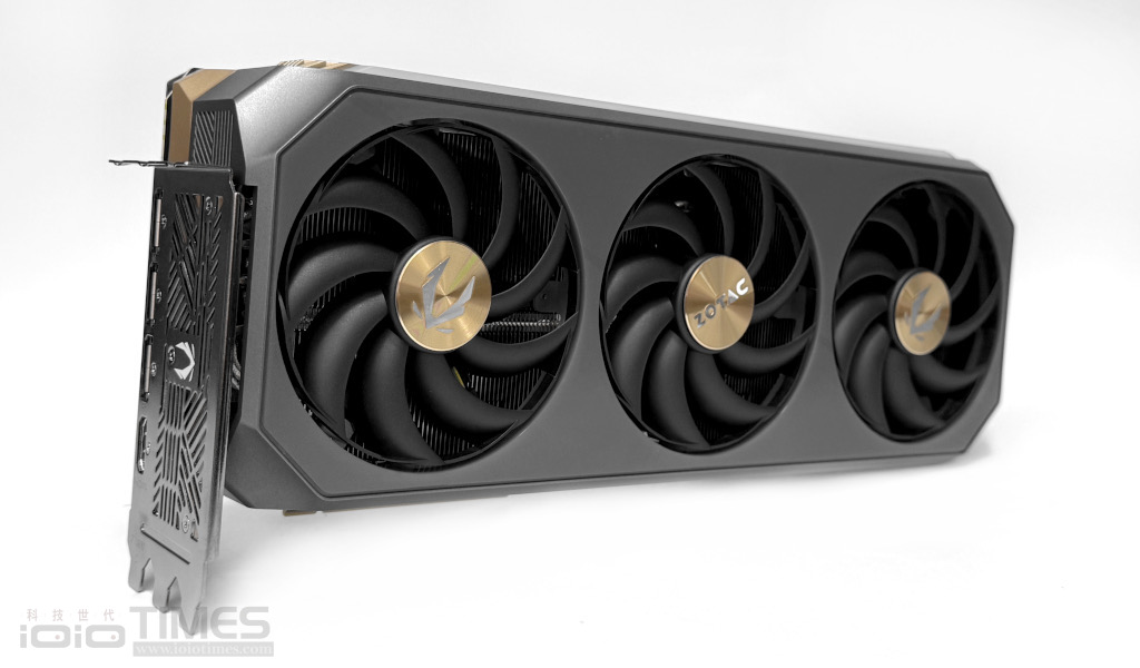 顯卡正面可以看到有 3 組風扇設計,並貼上了金色亮面圖徽,具備長形八角造型與灰黑色調設計,外觀視覺上顯得更加沉穩內斂,一改與前代的流線風格造型,反走較為硬朗的硬派模式。