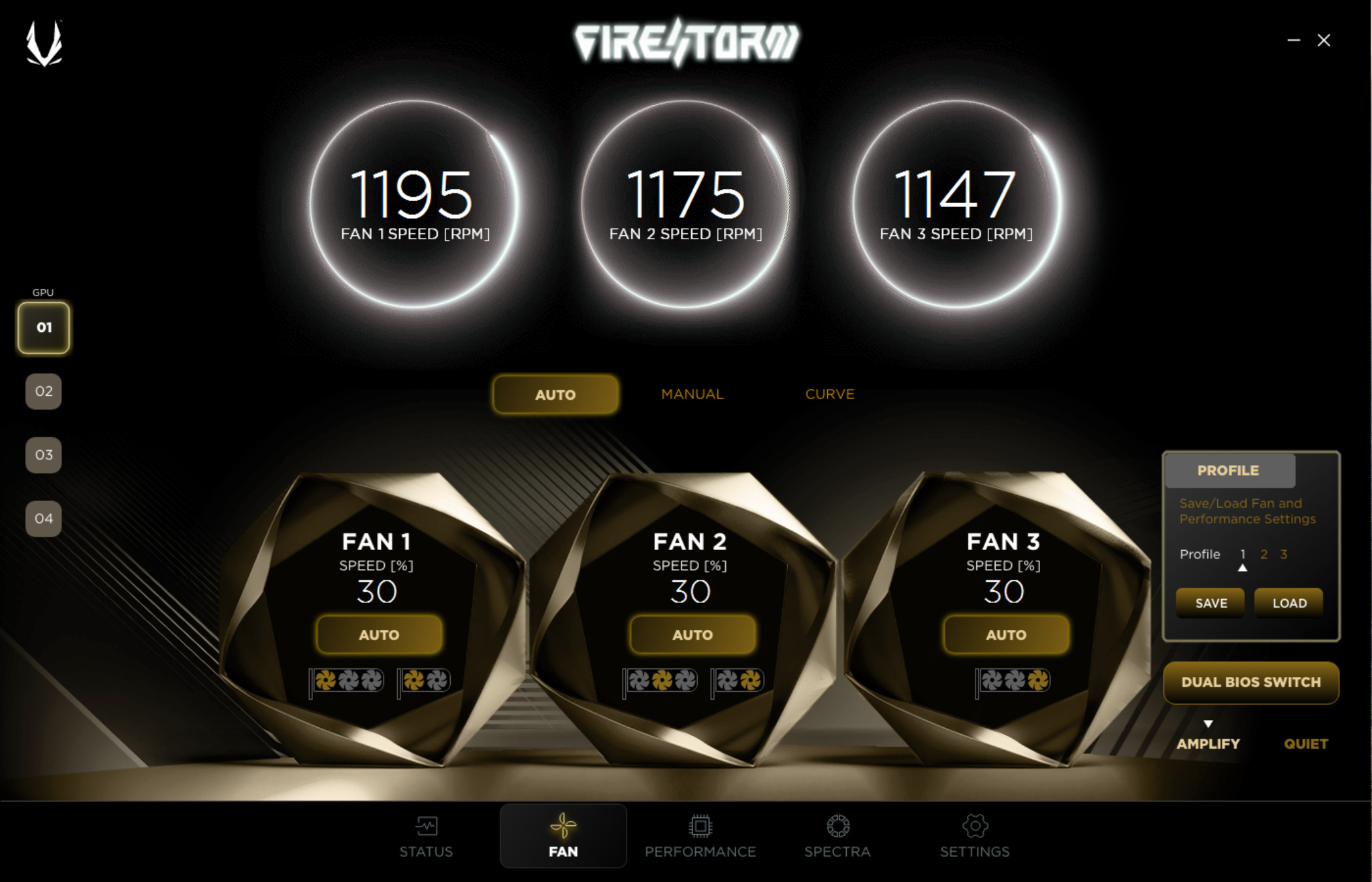 在開始效能測試之前,先來簡單看一下關於 ZOTAC 顯示卡專屬的 FireStorm 應用軟體,基本上先前幾款開箱過的 ZOTAC GeForce RTX 50 系列也同樣有支援這款專屬軟體,除了提供目前顯示卡的運作狀態之外,也能對風扇轉速、記憶體頻率、核心頻率、電壓、RGB 燈效等等做個人化偏好設定,另外,這次的 AMP Extreme INFINITY 的 3 顆風扇都是可獨立設定的,100% 全速運作下的轉速也是高達 3000 rpm 以上,基本上預設模式也是以 30% 運作,以避免產生較大噪音值,但如果有全速運作需求的話,這三顆風扇也能替顯示卡帶來高效的散熱能力,穩穩地壓制住高速運作下的廢熱問題。
