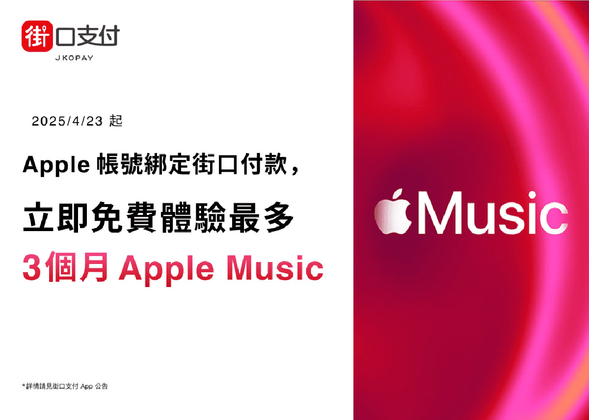 街口支付即日起推出「街口用戶專屬 Apple Music 免費體驗」限時優惠,民眾只要於 Apple 帳號綁定街口付款,即可立即免費體驗最多 3 個月 Apple Music,符合條件的舊用戶亦可享 2 個月免費會員資格,先前已完成綁定的用戶也同享優惠,輕鬆享受最高音質、沉浸式空間音訊與 Apple Music 獨家內容,並同時擁有付款「免 1.5% 海外交易手續費」、「指定支付工具最高回饋 3%」、「所有購買與訂閱項目一目了然」多項優勢,以及街口支付不定期推出首綁首購領街口幣、消費滿額享高額街口幣等豐富活動優惠。