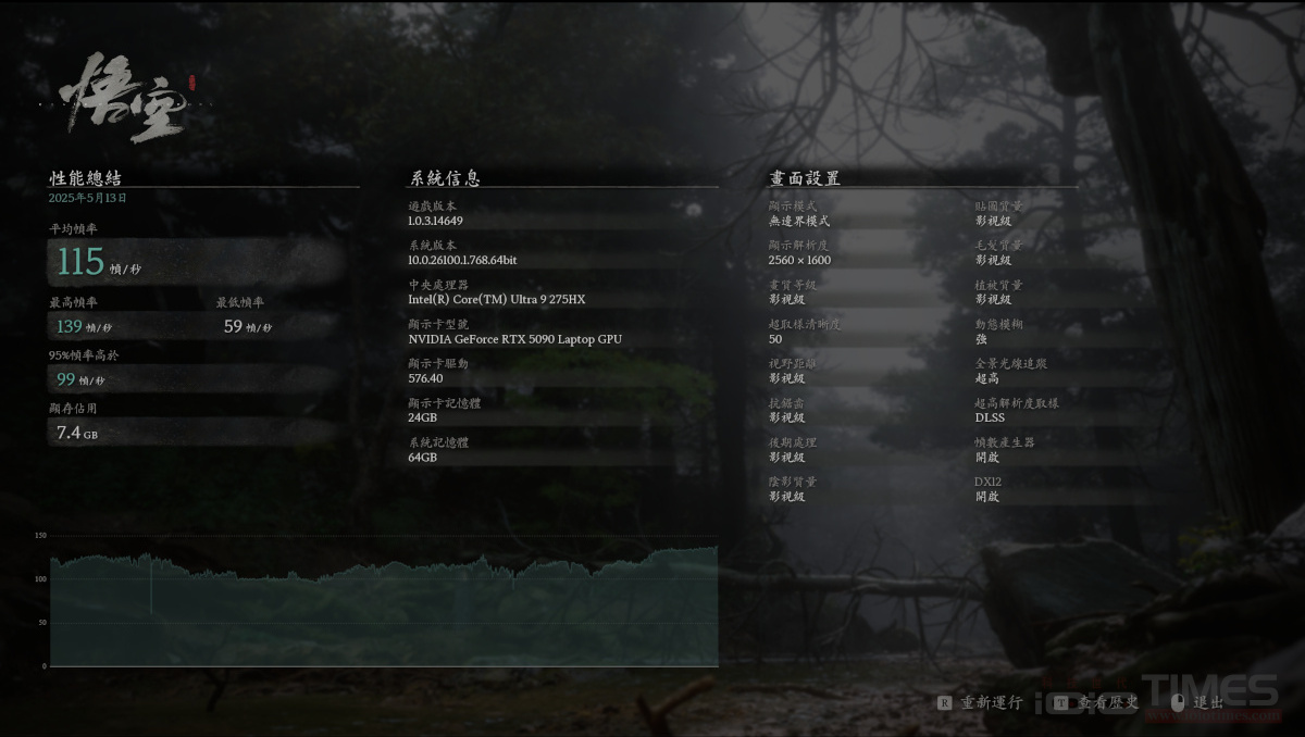 《黑神話:悟空》的部分直接就是偵測為最高的 “影視級”,以 2560 x 1600 解析度、開啟 DLSS 超取樣精度設定為 50 的情況下,全景光追關閉時測得平均幀數為 124 FPS、全景光追開啟時則是獲得平均幀數 115 FPS,基本上也都是超順暢的遊玩體驗,而且遊戲畫質能保持最佳化。