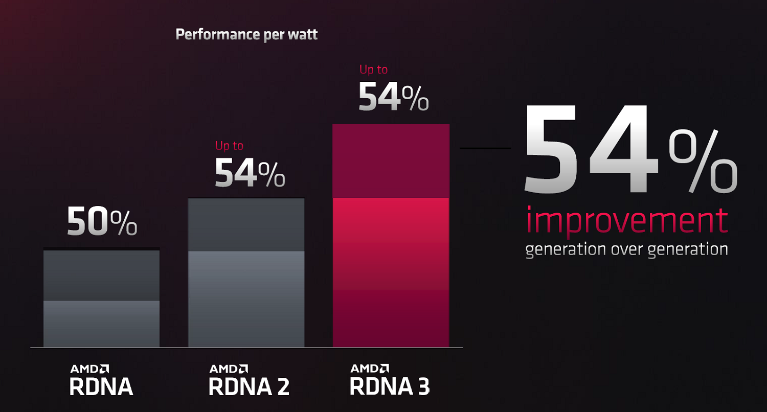 而透過可依照遊戲工作階段調整的時脈控制、AMD 更為先進的電源管理機制和 5nm 製程的優勢,讓 RDNA 3 架構的單位功耗不僅可以比上一代 RDNA 2 降低 25%,浮點運算性能更是從 23 TFLOPS 飆升到 61 TFLOPS,使每瓦效能有著 54% 的提升。