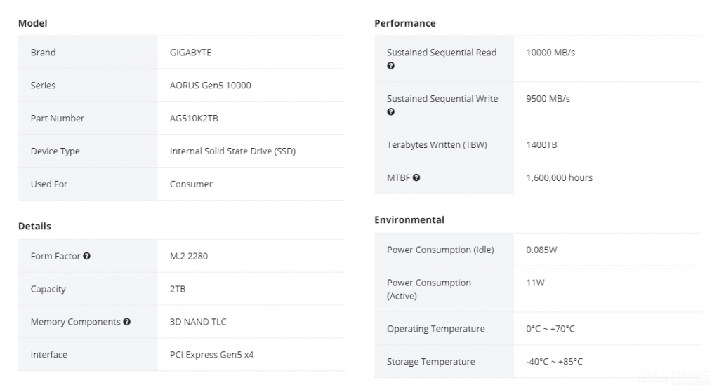 下面也附上關於這款 AORUS Gen5 10000 SSD 的相關資訊,目前從下表可以看到的是容量為 2TB,至於讀寫速度方面則是 10,000/9,500 MB/s,採3 D TLC NAND 顆粒設計,並且提供 1400TB TBW 以及 160 萬小時的 MTBF 保障,更多實際表現就得等未來有機會入手才能實測看看了。