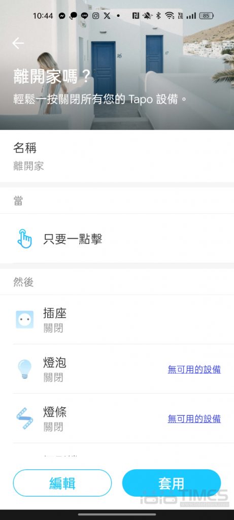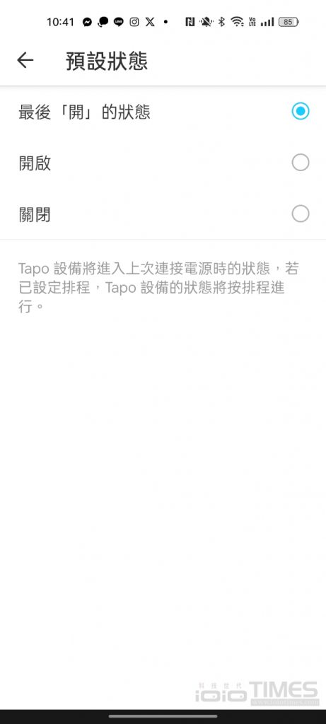 完成 App 設定後就可以看到在軟體主頁面「我的家庭」最愛選單中、出現了藍色方塊,這就是 Tapo P125M 的設定選單,正中央為「開啟/關閉」的控制按鍵,下方有 “排程”、”不在家”、”計時器” 等三種設定模式可以自行運用,其中的計時器對於日常的一些使用上可是相當方便的功能。