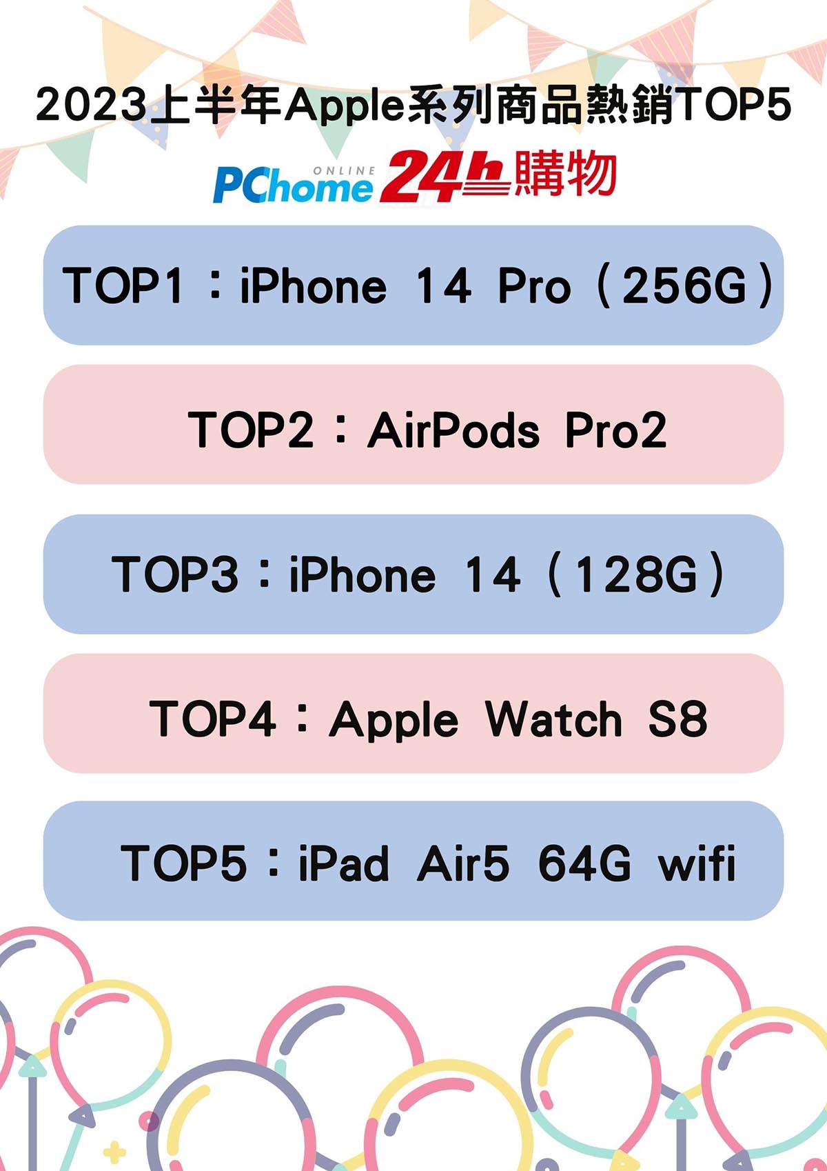 而第二季起,智慧型手機的消費需求也緩步回升,伴隨著庫存回歸正常,像是自 5 月起,站上整體 Apple 系列商品買氣增溫,尤其 iPhone 14 Pro 系列更較前一個月成長近7成。作為全台電商唯一 Apple 全系列授權經銷商,PChome 24h 購物也公布上半年 Apple 系列商品熱銷 TOP5:iPhone 14 Pro(256G)、AirPods Pro2、 iPhone 14(128G)、Apple Watch S8、iPad Air5 64G wifi,觀察發現最受果粉青睞的是 iPhone 14 Pro(256GB),顯示民眾購機預算提升,願意採購「高階機型及大容量」,已成為市場銷售趨勢。