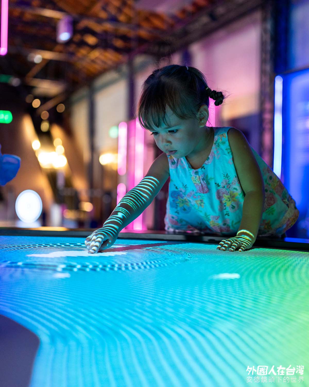 第一次搭乘火車的娜娜從前一晚就非常興奮,從上車就盯著沿途風景看不停,一進到隆田 CHA CHA 文化資產教育園區便直衝戶外白色巨型的彈跳小丘,一邊玩彈跳還可以同時一覽珊瑚潭的全貌!小朋友可以享受舒適的彈跳空間,開心的左跑右跳盡情放電!進到北倉以嘉南大圳為主題的互動學習區時,娜娜不但是追著牆上地面的互動光影跑、還開起挖土機蓋房子;南倉一層樓高的水路柏青哥及溜滑梯、以及用嘉南平原農業地景為概念所做的地景跳格子,都因為結合機械、聲音、燈光,碰觸各個裝置時產生不同燈光效果,再加上踩踏的色塊會發出嘉南農作生態環境聲響或遊戲音效,娜娜在這個地方玩得最開心,遲遲不想離開。