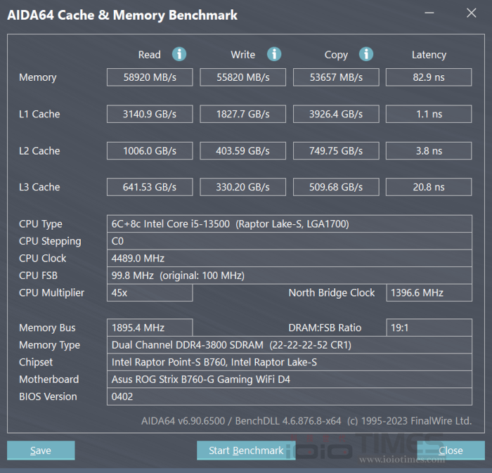 在預設 DDR4-3200 CL 22 的模式下,透過 AIDA64 Cache & Memory Benchmark 中的讀取、寫入、複製以及延遲等項目的成績則是落在 49847、46645、47015 MB/s 以及 73.8 ns,以標準 DDR4-3200 的表現來看,相當接近 50000 MB/s 的表現已經是相當不錯了,如果可以在往上提升至 DDR4-3600、DDR4-4000 的話,那肯定數據會更加漂亮些,後面就來試試看。