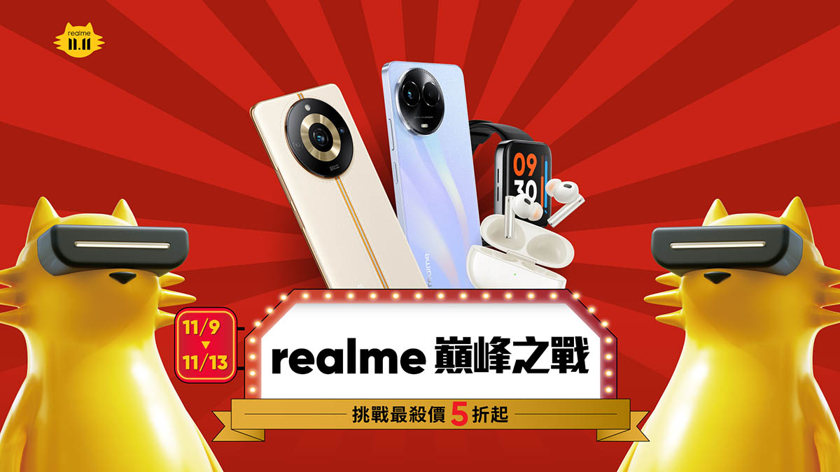 全球成長最快智慧型手機品牌 realme 參戰一年一度雙11盛事,正式打響「巔峰之戰」,將為粉絲帶來不愧對巔峰之名的超強折扣力度,讓消費者看得開心,買得過癮,輕鬆清空購物車!realme 雙11正檔活動即日(9日)開跑,手機界的精品 realme 11 Pro 巔峰價 $8,811 元,更多促銷品項最低 5 折起,活動期間至 11 月 13 日,下單趁現在。