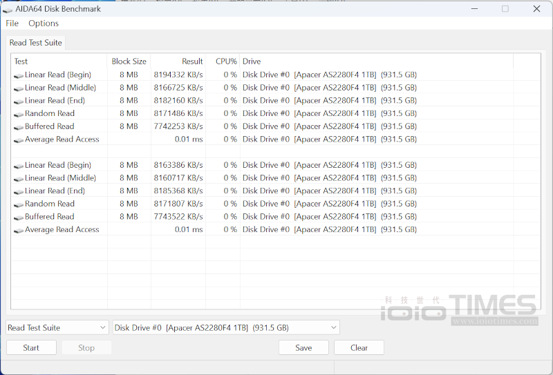 另外也透過 AIDA64 Disk Benchmark 中的 Read Test Suite 來檢視一下讀取方面的性能表現,不論是 Linear 線性讀取的部分或是隨機讀取等,表現大概都落在 8000 MB/s 以上,2 次測試下的數據基本上都差不多,也代表實際在應用面使用時的讀取表現。