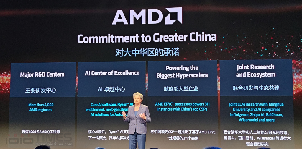 接著就是 AMD 董事會主席及執行長 Lisa Su 來說明 AMD 在 AI 人工智慧方面的發展趨勢與策略,包括對大中華區的四大承諾:主要研發中心、AI 卓越中心、賦能超大型企業、聯合研發與生態共建。