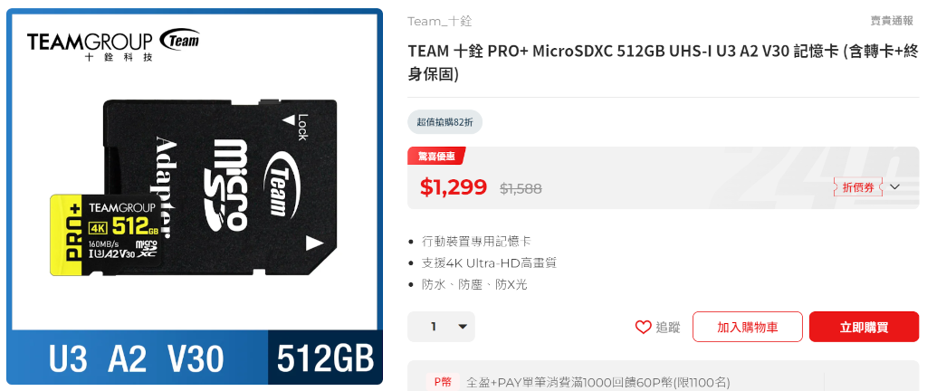 鑒於每次外出時、手上的 GoPro 除了換電池之外還要換記憶卡的麻煩,直接上一張高容量又能高速儲存的 MicroSD 卡就解決問題了,直接相中 TEAMGROUP 推出的這款 PRO+ 系列的 Micro SDXC 小卡,512GB 容量的價位落在 1,000 出頭也算頗 OK,官方標示讀取速度可以達到 160 MB/s,4K、UHS-I、A2、V30、U3…等規格,看來是不錯的,那就入手來試一下就知道好用不好用了!