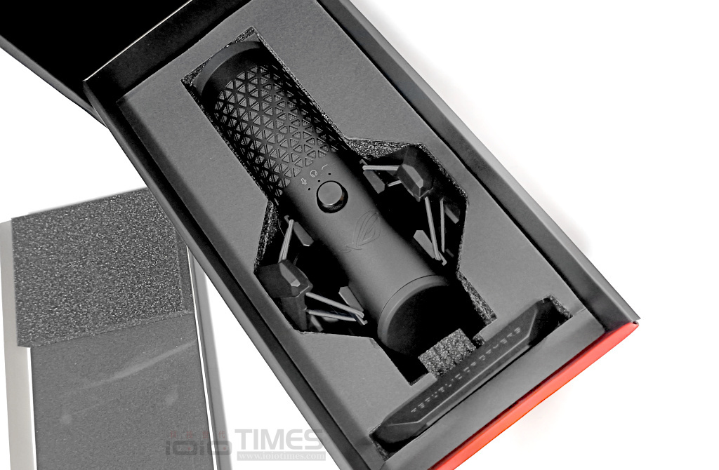 開箱後可以看到躺平在裡面的ROG Carnyx麥克風本體,基本上也是有仔細妥善包裝,底下空隙有塞保麗龍保護,取出後的本體間隙中也有塑膠隔板防止摩擦。
