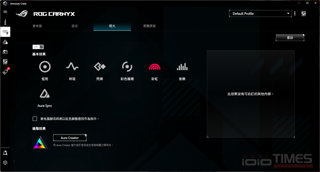 由於隸屬於 ROG 產品系列,基本上透過官方專屬的 Armoury Crate 應用軟體可以操控,透過 USB 連接電腦後就可以在軟體中找到 ROG Carnyx 的設定選項,除了主頁面有麥克風的噪音抑制、完美音質以及高通濾波器可選擇是否開啟外,在”等化器”這一欄還有「自然、厚實、清亮」三種模式可選擇。