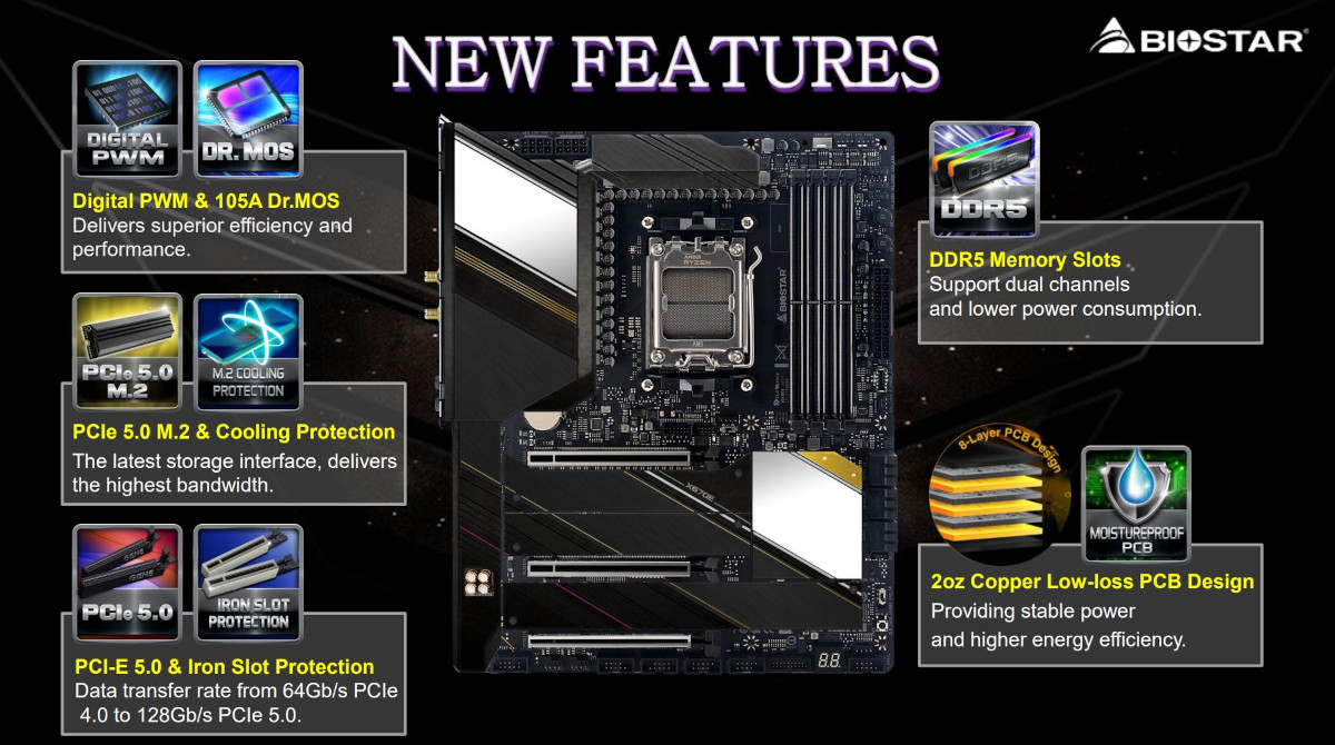 主機板廠商基本上就是 ASUS、GIGABYTE、MSI、ASRock、BIOSTAR 這 5 家,皆採用 AM5 插槽架構、支援 PCIe Gen 5 M.2 SSD 與 DDR5 記憶體,以下就先從 ASUS 看起: