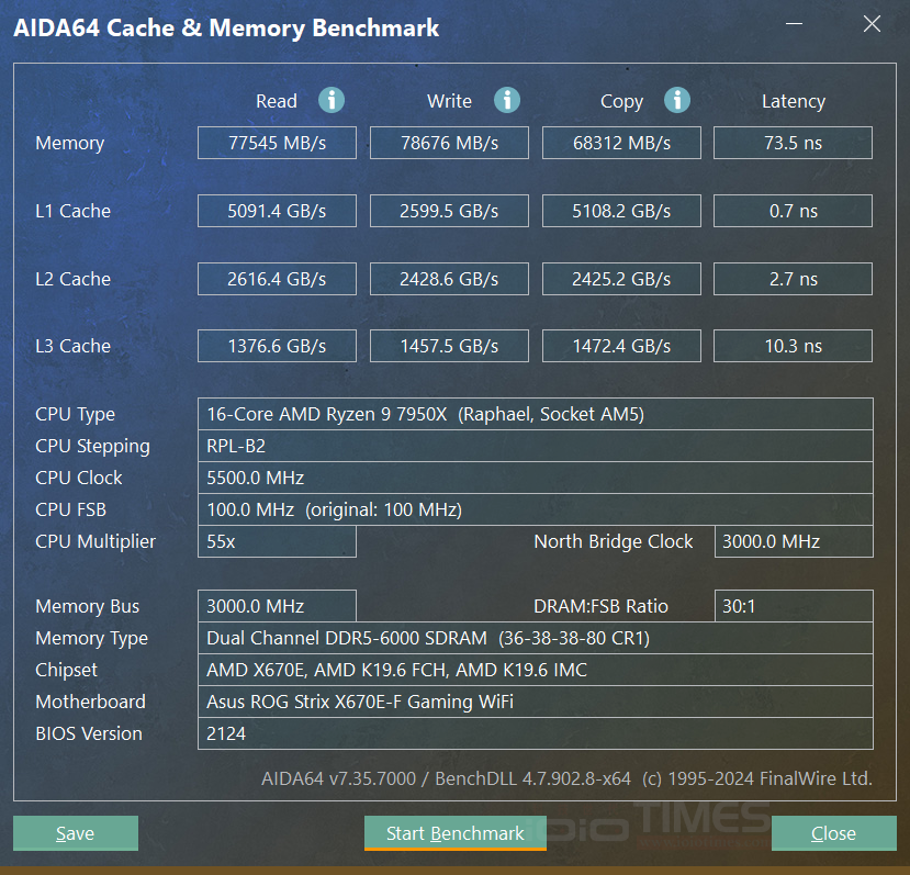 先來看 DDR5-5600 的測試,讀取、寫入、複製這三項的表現分別為 73649、74867、65217 MB/s,延遲為 79.5ns,調成 DDR5-6000 模式時,讀取、寫入、複製這三項的成績則是提高至 77545、78676、68312 MB/s,大體上的提升幅度約 5% 左右,此時的延遲也進一步來到 73.5ns。