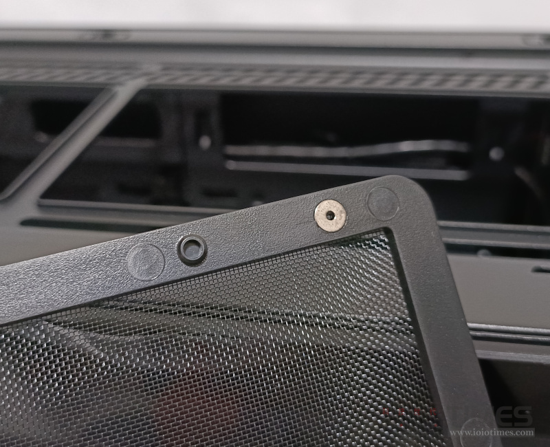 下面就是免工具拆卸的部分,包括前面板、上蓋、側板等等都是採用免工具設計,玩家用手就能搞定,這部份對於需要拆卸或是需要開蓋檢查時就顯得十分便利,除了玻璃側板可以手轉背面固定螺絲就能取下外,上蓋由於是透過卡榫固定,所以只需用手往上一抬 (輕施力) 就能掀起上蓋,底下有磁吸式濾網,同樣能輕鬆取下。