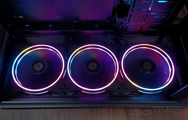 事實上預裝的 ARGB/PWM 散熱風扇的燈效表現相當不錯,連續運作時的噪音值也相當低,主要搭配前端下方的一排 RGB 燈條可以看到整體的表現十分亮眼,正面下方還有造型設計的燈效以及發光的 AORUS Logo。