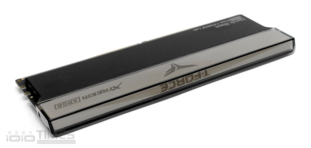 DDR5 版本的 XTREEM ARGB 並不像 DDR4 那樣採用全鏡面設計,結合無光版的 DDR5 下半,讓整體的設計風格在保有獨特的 Narvik Black (那維克黑色調) 黑色系噴砂質感下、兼具幻彩光效的幻鏡特色,至於 T-FORCE Logo 則位於上半部的中間,與側邊的 XTREEM ARGB 等標示一同在燈效中閃耀。