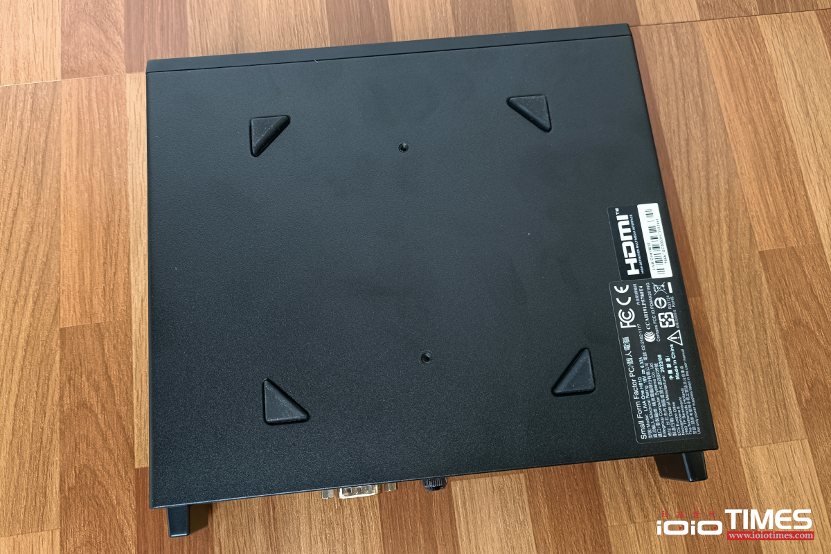 底部有設計支撐腳墊,下方一腳可以看到有標示小型個人電腦以及產品型號、安規等。