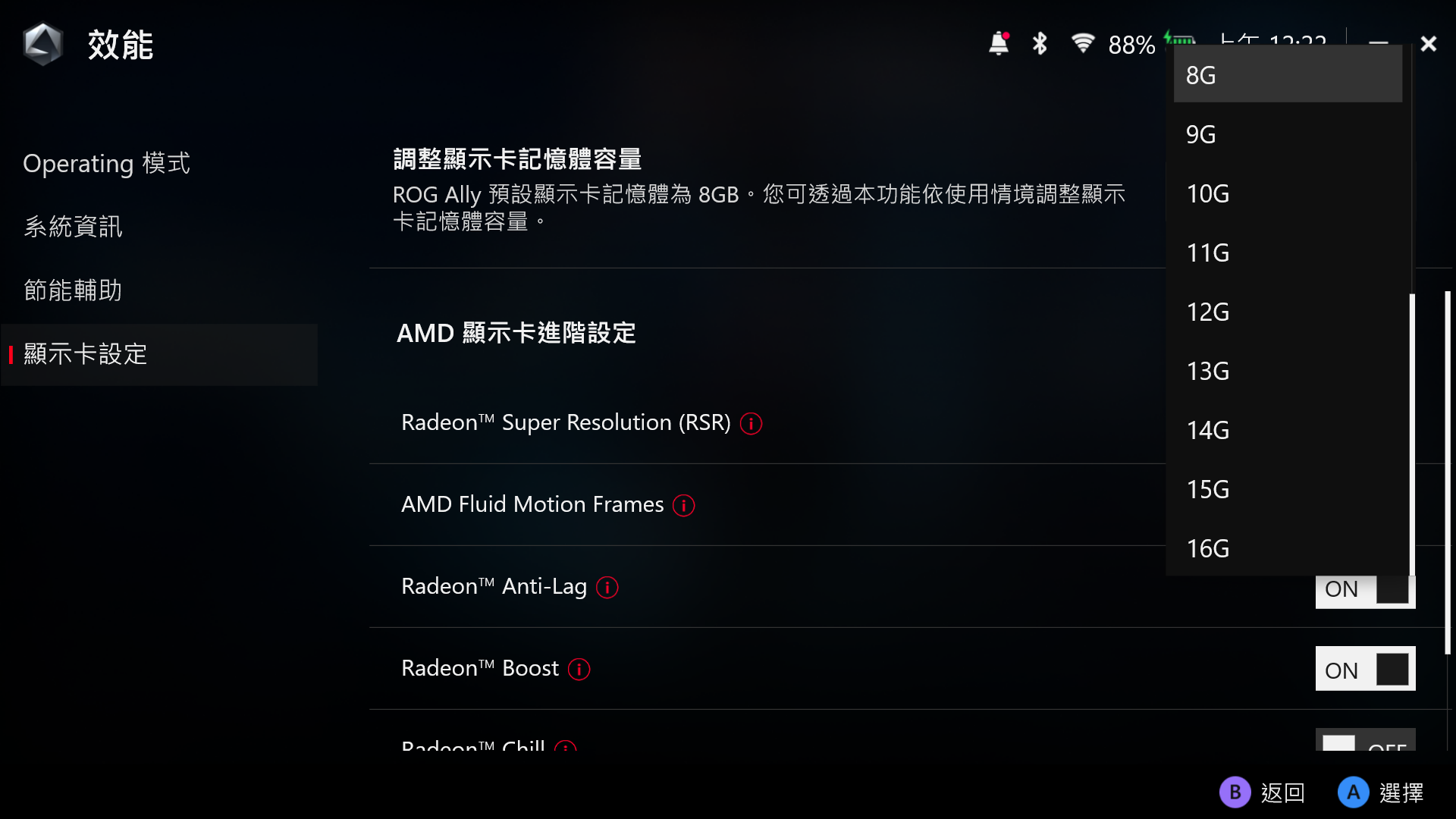 顯示卡設定上也能調整記憶體容量,Ally X 增加了記憶體容量到 24GB LPDDR5-7500,相比原先的 16GB 來說是有更大的可調整空間。