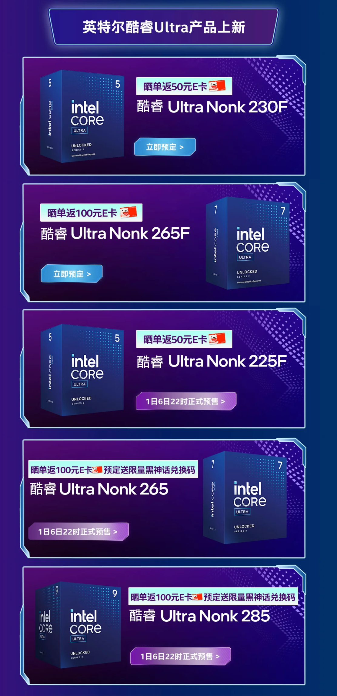 目前京東的預售活動還有一些好禮優惠,像是曬單可以退 50-100 (人民幣) 京東E卡、送《黑神話:悟空》遊戲兌換碼 (限265/285兩款處理器),以及曬單抽限量周邊商品等,至於行動版的 Core Ultra 200H/HX 等系列在 CES 2025 發布後據傳僅會在中國與韓國率先上市開賣,其他國家販售則須多等 1 個月,看來 Intel 官方很重視這兩區的需求 (哈),對一般消費者來說,行動版對應大體上是筆電或輕薄型裝置,桌上型先開賣可以搶先入手體驗!
