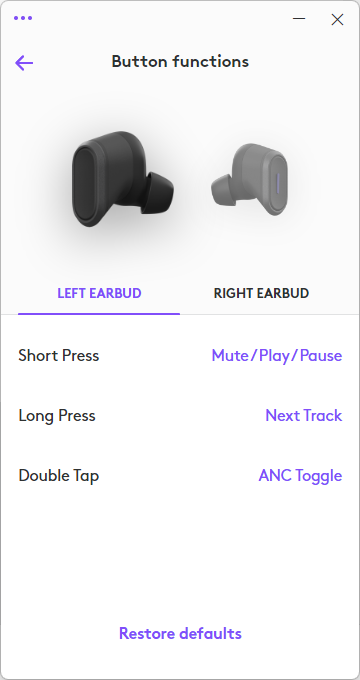 將 Logi Tune 安裝在筆電或桌機上頭其實功能方面也是差不多的,可以看到左右耳各自的電量,也可以設定隔噪功能的開啟或關閉,左右耳的按建功能設定也可以自行調整,基本上算是十分方便使用者操作的。